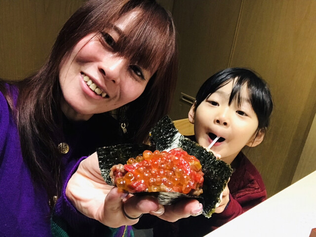 牛をレアで焼いてもらい炙った海苔にたっぷりのいくら、溶き卵をのせて贅沢にいただきます。