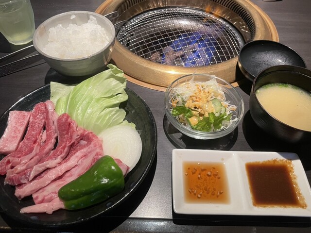 妻は肉めし定食を私はカルビ焼肉定食を注文。肉めし定食は、ご飯と具材(焼肉と玉葱が甘辛の味付け)が別々の丼に出てきたのはびっくりでした(初体験)。カルビは綺麗なスジ入り、口溶けも良く大変美味でした。テーブルに組み込まれた網の下には炭火ではなく溶岩。大満足の昼食でした。ご馳走様でした。