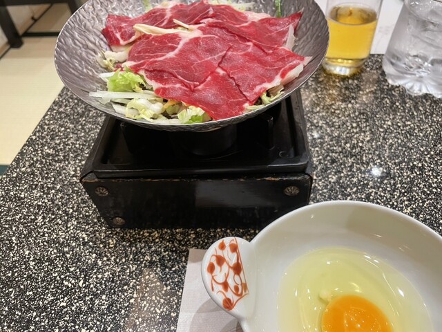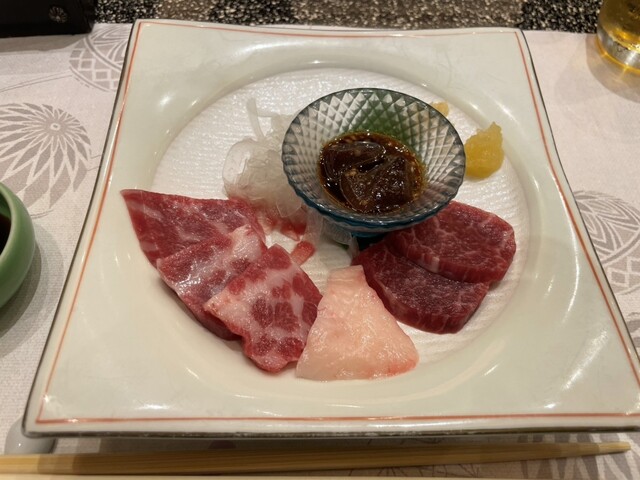 ・お通し、馬刺し、すき焼き、揚げ物、太刀魚の煮物、ご飯/お吸い物、デザート(朝鮮飴)