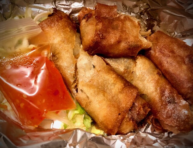 テイクアウトをお願いして、お料理を受け取りに行くと、道ゆく人が囁いているのが聞こえました。このお店どう?前来た時おいしかったよ。。本当に評判通り、どのお料理を注文しても安くておいしいんです。今回はヤムヌア(牛肉のサラダ)、トートマンクン、(海老のすり身揚げ)、ポピアトー(春巻)クンガティアムプリックパオ(海老のガーリック炒め)ガイパッメッマムアン(鶏肉とカシューナッツ炒め)、プーパッポンカリー(ソフトクラブシェルの卵カレー炒め)をお願いしてありました。テイクアウトで利用するのは久しぶりで、食材価格高騰で多分食材が小ぶりになったり量が減ったりしているんだろうな、なんて懸念していたのですがいつも通りの屋台感いっぱいのビニール袋を開けて見ると、中身はたっぷり!お皿に開けてみてびっくりです。サービスでカオニャオ(タイの白ご飯)までつけていただいていました。こんなに注文して、お会計は5770円ですって。