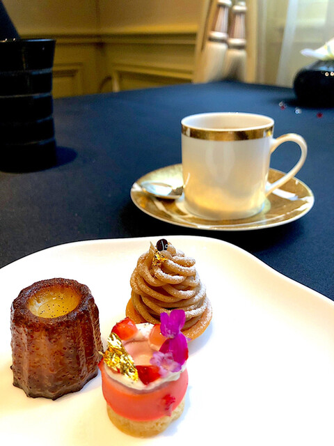 小菓子のワゴンのときにはかなりお腹いっぱいだったので、大好きなロブションのカヌレ(これは絶対食べたいと思っていました)に、好物のモンブラン、名前は忘れましたがピンク色の可愛らしい小菓子を頂きました。