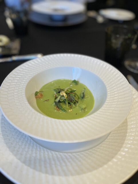 ・リコッタチーズを詰めたラヴィオリにグリーンアスパラガスのヴルーテを注いで