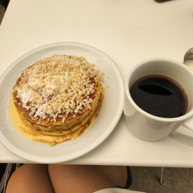 マカダミアナッツバターミルクパンケーキに美味しすぎるホイップ追加!美味しい深い系コーヒー。明るいテラス席と緑と。