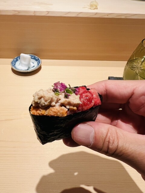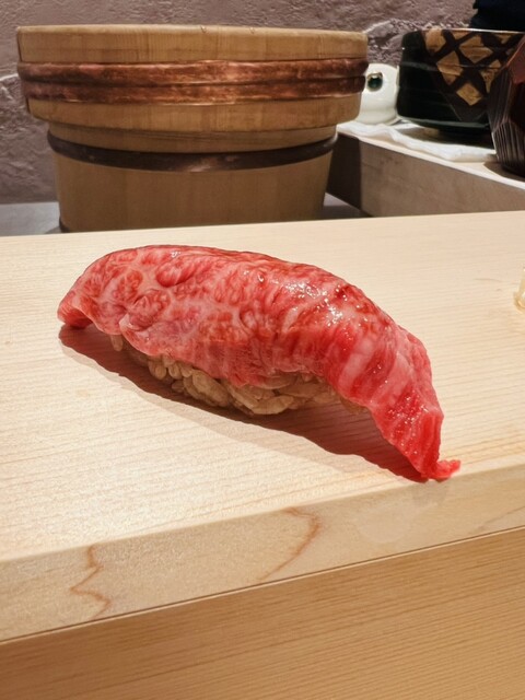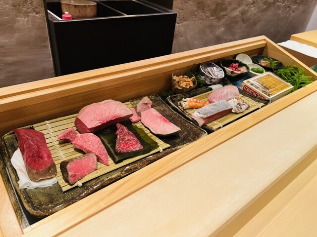 肉寿司なので肉オンリーかと思ったら魚介とコラボで握るお寿司だったので私的には感動と衝撃のフルコンボでした♪