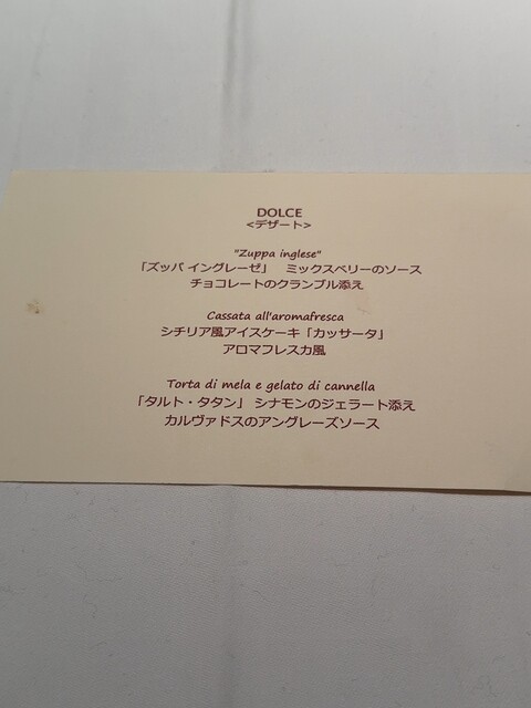 • デザート:ズッパ・イングレーゼ(ミックスベリーソース/チョコクランブル)