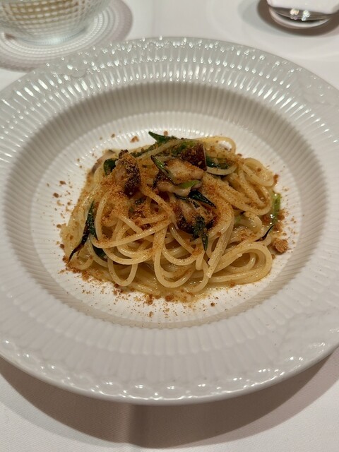• パスタ:原木しいたけと九条ねぎのスパゲッティーニ/イタリア産カラスミパウダー