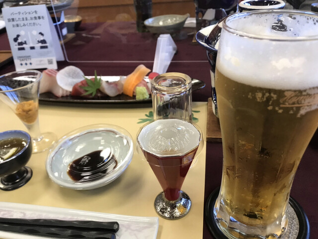 生ウニ、刺身の盛り合わせ、カンパチ、マグロ、タイ、ヒラメ、イカ