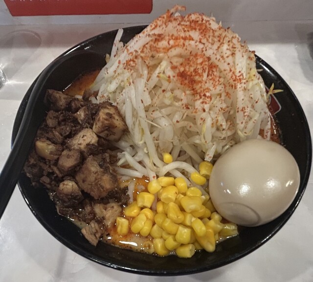ベースはからみそやラーメンのスープで、違いは先述のもやしがたっぷりなのと、とろとろチャーシューの代わりに角切りチャーシュー、海苔の代わりにコーンが入っているところだろうか。