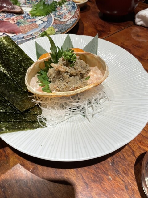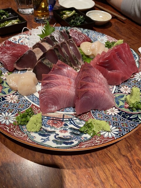 料理はまず刺身の盛合せは外せません。定番のいぶりがっこクリームチーズやアサリの山椒煮、梅水晶、どれもお酒が進みます。