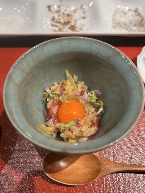 ユッケ仕立てにし、濃厚な卵や牛醤、玉ねぎのスライスと合わせており、馬肉の脂がご飯をコーティングするようなまろやかさがあり、めちゃくちゃ旨い!!