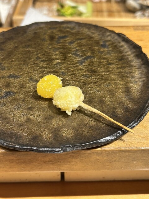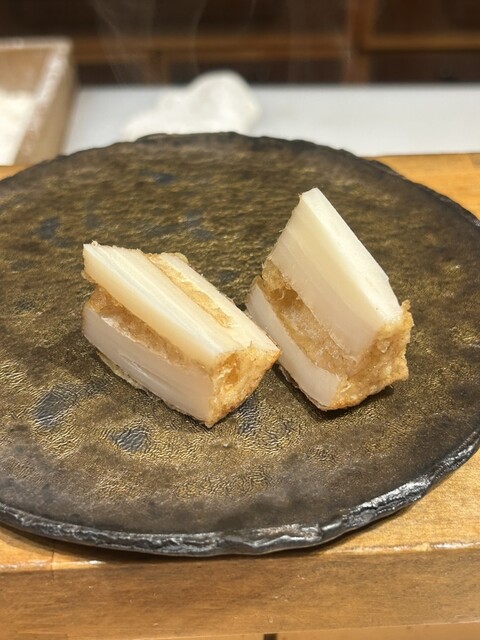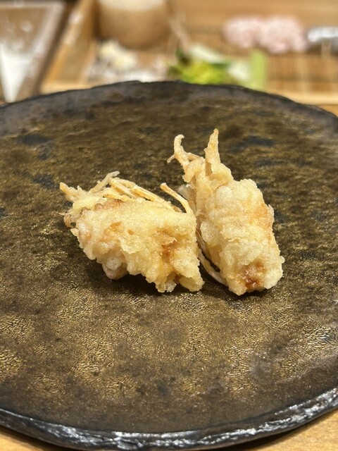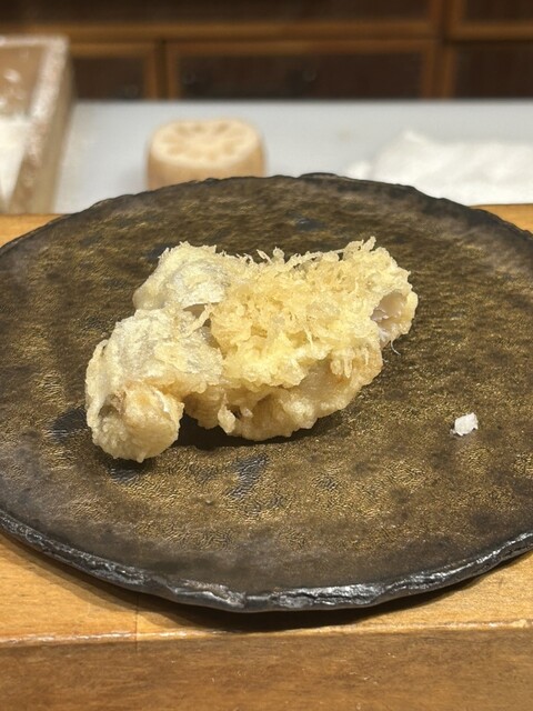 肉厚で衣は軽くサクッとしていながら、中はジューシーで、椎茸そのものの強い旨みを感じれて最高!!こがし醤油塩の香りもたまらないね!!