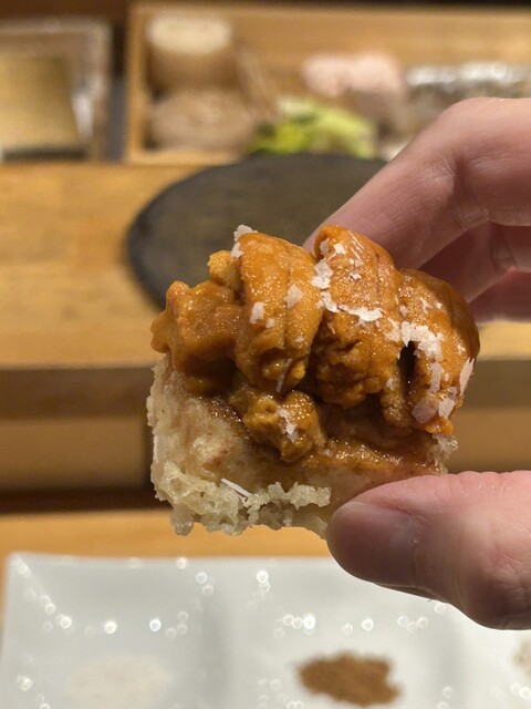 香ばしいごま油の香りとウニの濃厚な旨味がフォカッチャの風味を引き立てていて、外はカリッ、中はモッチリとした食感があり、一口ごとにウニの甘みとコクが広がり超絶旨い!!これはヤバイね!!