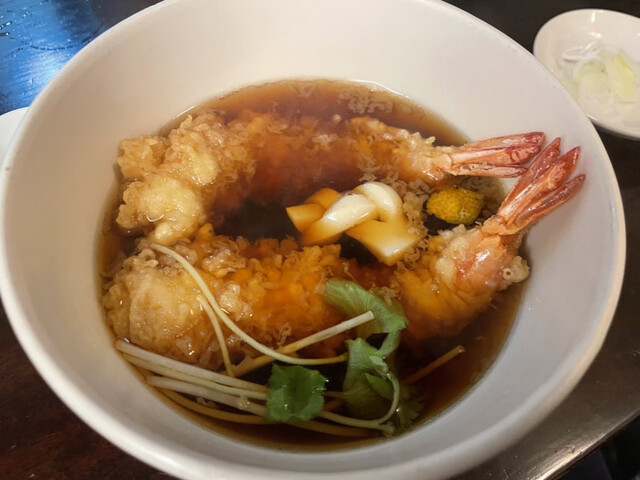 つまみでそれなりに満腹でしたがするすると食べられました。添えられて来ためんつゆでいただくのもいいですが、天抜きのつゆに入れていただくとほっと温まります。