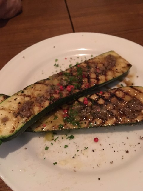 ズッキーニは、一本を半分に切ってグリル。ボリューム感あり、アンチョビソースが香ります。