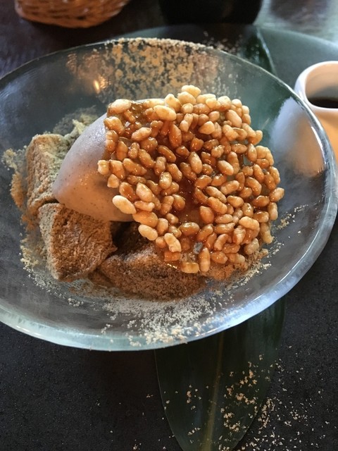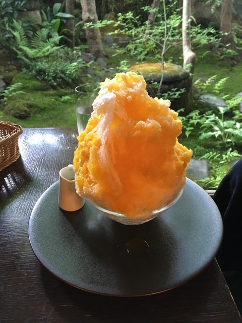 趣きあるラウンジで、マンゴーかき氷とほうじ茶セット、ワラビ餅とほうじ茶セットを頼みました。友人とシェア。