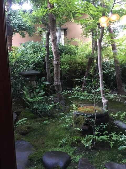 ガラス越しの壺庭は、苔むしていて、この暑さでどのように苔を育てているのかと考えていたら、時折ミストが噴霧されており、謎が解けました。