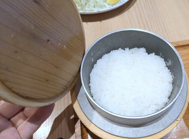 それでもカツが肉厚で、粗い衣はサクサク、ジューシーで柔らかいことは言うまでもなく満点級なのですが、炊きたてのご飯がお釜ごと出てくるのも圧巻です。厚い木蓋のお釜のサイズは一合炊きでしょうか、小さめのお茶碗に山盛り2杯がとれます。味噌汁は赤だしのしじみ汁で、他店と同様ですが、これもとても美味しいです。
