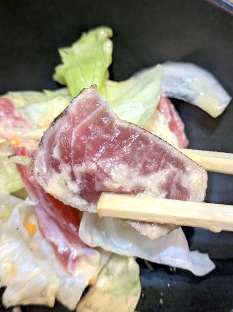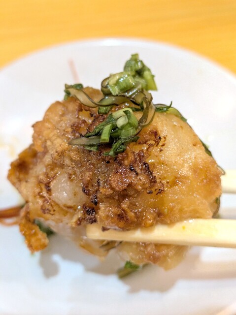 屠殺日のみの新鮮な豚塩レバー、何を食べているのかわからないほどの臭みのなさです。これは秀逸です。海峡生牡蠣は濃厚な知内産で、北海道育ちの私もその存在を知りませんでした。これがまた濃厚で美味。驚くのはシロコロホルモンの唐揚げ・・・ 串焼きではよく出てきますが、唐揚げにするとなんとも言えないカリカリ&中はぷるぷるでとろけます。生まれて初めて食べました。海鮮サラダは、マスターの手違い(ご愛敬)で最後にドレッシングをかけてしまったために具がよく見えませんが、マグロなどの海鮮がたっぷり入った新鮮なサラダです。