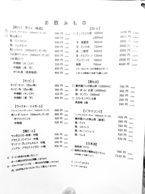 そのほか、ドリンクは写真のように、基本は1杯ものではなくセットです。つまり、レモンサワーセットを頼むと500ccの炭酸1本とキンミヤと氷入りのグラス、そしてレモンを皮ごとすりおろした超甘みなしのスムージーボトルがついてきて、これで自分好みのサワーを作ります。当然、炭酸が余るので、2杯目・3杯目は中だけ追加で頼むというホッピー形式です。これはハイボールでも同じシステムです。珍しいですよね。うどんやご飯メニューも豊富で、食堂を名乗るだけありますが、土鍋でご飯を炊くので注文から40分ほどかかりますw ただ、一人で二合飯は食えません。