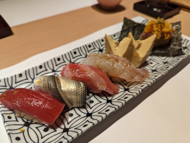 博多ということで明太子を使ったちょっと変わった茶碗蒸し(これがまたクリーミーで不思議なおいしさ)を挟んで、再び握り。そしてデザート。これだけのボリュームで、ランチとはいえ場所や雰囲気を考えればなかなかリーズナブル。