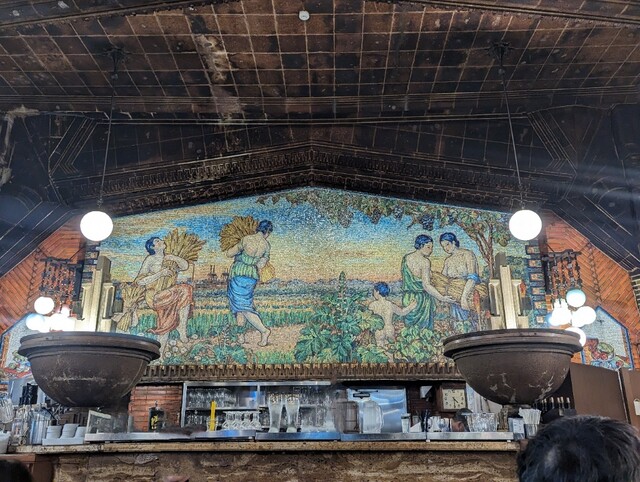 突き当りカウンターにはこれまた創業当時と変わらぬモザイクタイル画、そして噴水…。