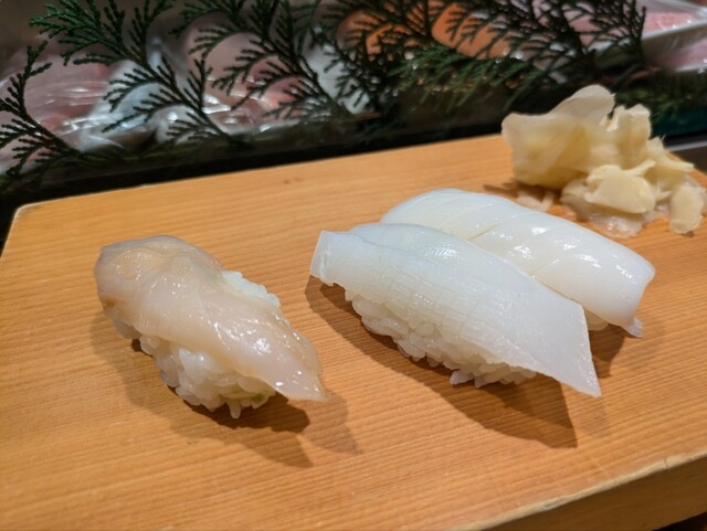 白みるにイカはスミイカorアオリとのことで両方を。スミイカは上品なほのかな甘味、アオリはしっかりとした甘味が感じられ、シャリの程よい酢の加減が甘味を引き立たせる。白みるも当然旨い。