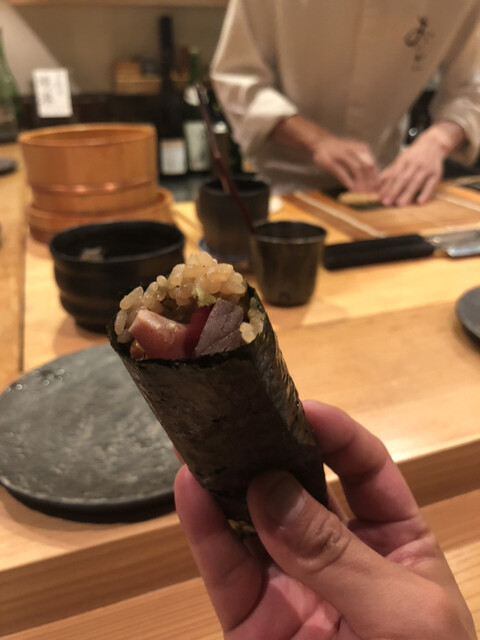 言わずもがな毎回登場するいろんなマグロの巻物や一階のミュラン店、天麩羅みやしろさんの揚げる海老天の手巻きも最高でした。