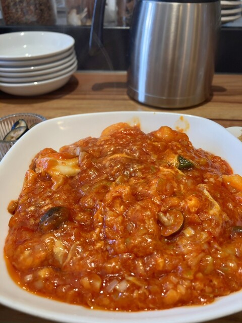 山盛りのエビチリにたくさんおっきめのエビ。ぷりぷりホクホク熱くてうまい、エビチリすくって、ご飯を拾ってお口にイン!熱い、うまい、辛い、最高です。