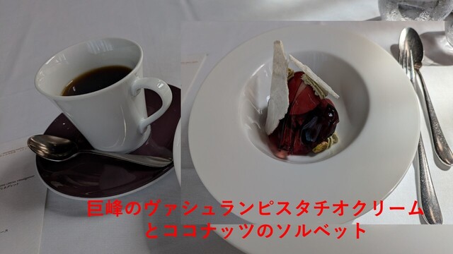 は「巨峰のヴァシュランピスタチオクリームとココナッツのソルベット」。どの料理もおしゃれで見た目もきれいで味も美味しい料理。
