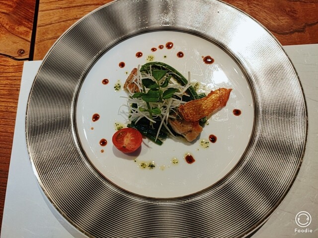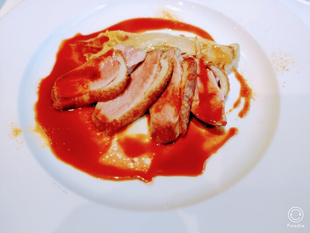 とうもろこしの甘じょっぱいエスプーマにポートワインのソースの甘みが効いていて、初めて頂く味...