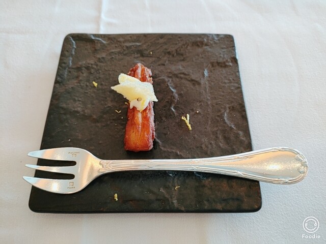 スティックアッシェはハンバーグの生地に松の実も入っていて食感もよく、付け合わせのフォアグラのフランをのせていただくのをオススメされ、その通りにすると濃厚な味になってお肉がまろやかになりました。+1000円のオプションでフォアグラをつけられますので、フランではなくロッシーニスタイルのハンバーグを食べたい方には追加をオススメ。