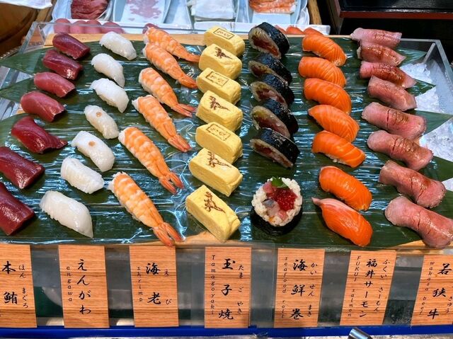 北陸の海の幸や寿司、焼きたての若狭牛ステーキ、揚げたての天ぷら、地元のグルメ等。