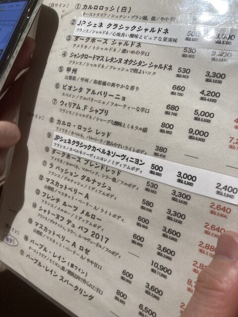分厚く重いワイングラスは、ビアジョッキみたいに量を多く感じさせる演出かな?