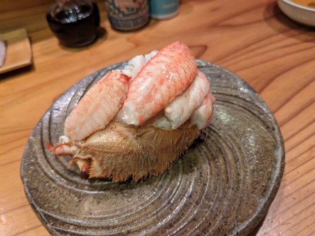 ポテサラ、お造り、毛ガニ、筍のお椀、ホタルイカ、からさめ
