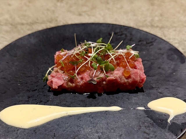 毎回頼む絶品メニュー。甘みのある牛とマリネされたイクラがとても合う、洋風の極上ユッケみたいな感じで大好きです。