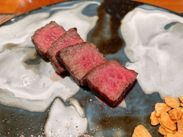 その次にいただいた牛刺し。この日は茨城県産の黒毛和牛でカメノコという部位。ほどよいサシ加減が美しく、いただくとみずみずしさが先にくる!赤身でも肉肉しい臭さはまったくなくて驚き。こっくりとしてちょっと甘めのお醤油がよく合っていた。