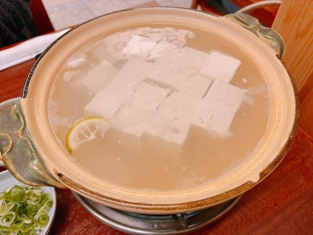 元々お豆腐は好きなので(正直どこで食べてもおいしいよね~)なんて思っていたが、こちらのゆどうふは一口食べて衝撃受けるくらいおいしかった!大豆の味が濃くて、それでいて滑らかな舌触りでつるつるぷりぷり。お出汁も昆布でしっかり取っているだろうけど、お豆腐の味がきちんと主役になっている。1人前でけっこうな量のお豆腐があったけど、青ねぎやポン酢でちょっとずつ味変しながら食べているとあっというまになくなってしまった.......