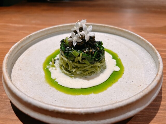 トップにしたのはニラを使ったビーフン。白いお花が可憐で可愛らしいけど見たとおりニラたっぷり。初めはこの香りがグッとくるけど、キャビアの味わいと塩気が広がると絶妙なバランスに。下の白いソースはお豆腐で、これでまろやかさが足されてもよかった!