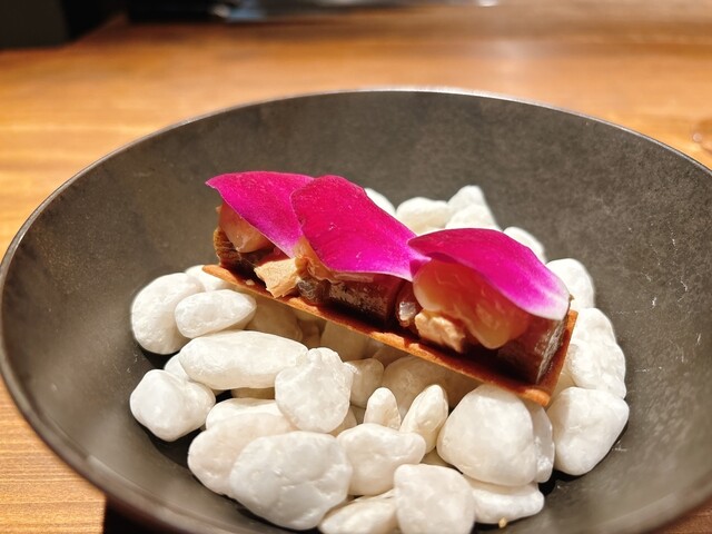 パリパリの八つ橋の上に、↑の食材が並んだフィンガーフード。紹興酒漬けの海老の香りから始まってニッキの甘い香りとフォアグラの甘さで全体がひとまとまりに。西京漬けのごぼうの香りと海老の甘さが余韻で残る、ここでしか味わったことのない独創的な一品。