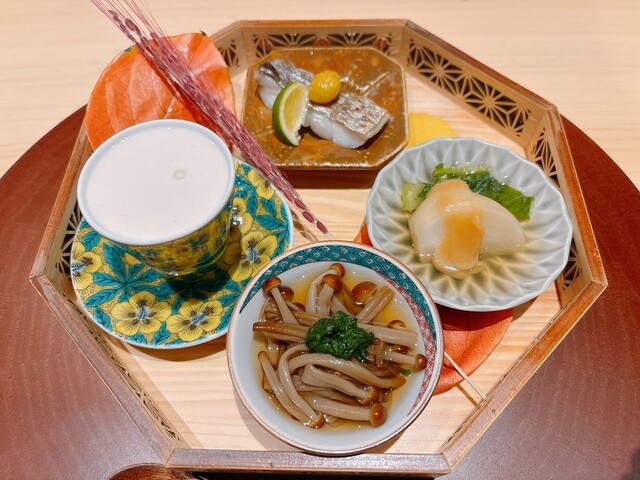 前菜四趣、この日の内容は太刀魚の塩焼き、山えのきのお浸し、ふろふき蕪、白子の茶碗蒸し。特に茶碗蒸しのクリーミーさには驚いた。中にごろっと白子が入っているだけでなく、上に白子のソースがたっぷりなの。隠された海苔の風味も抜群の相性。