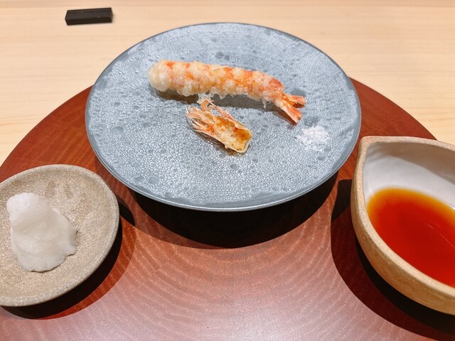 天ぷらも丁寧に1品ずつ揚げたてを提供してくれる。この日は車海老、白茄子、舞茸、海苔と白エビでした。車海老は火の通り方が絶妙で身のちゅるんと柔らかい感じも残っていて、甘みが強かったえbb頭の殻も揚げてくれるのが個人的に最高でした。揚げた海苔に白海老の漬けというペアも素敵すぎた。