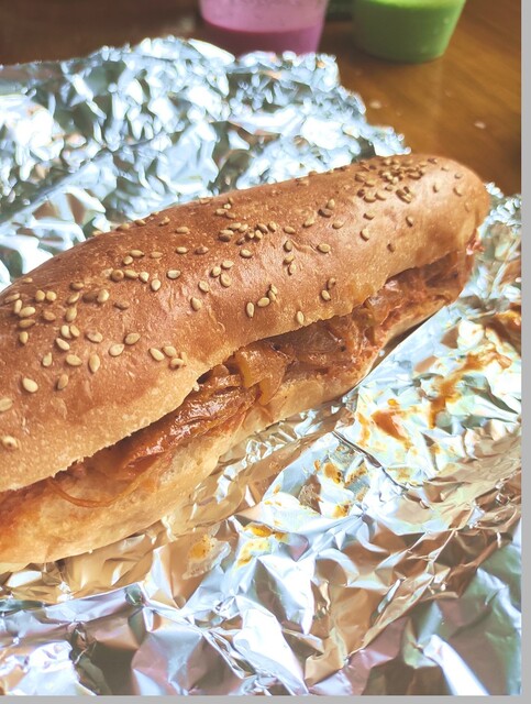上は、甘辛いチキンサンド。下は、ソーセージパン。