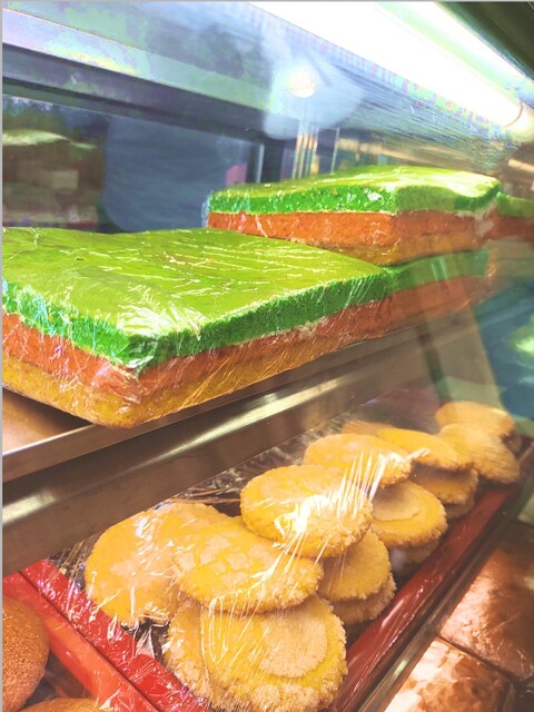 カラフルなカステラのようなケーキ。好きなサイズにカット売りしてくれます。