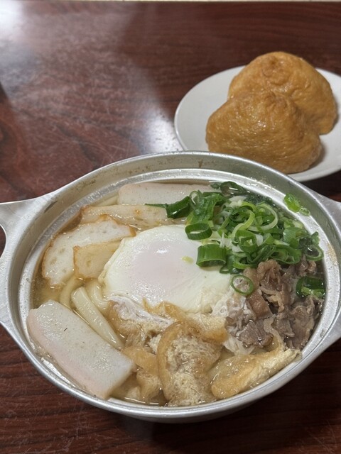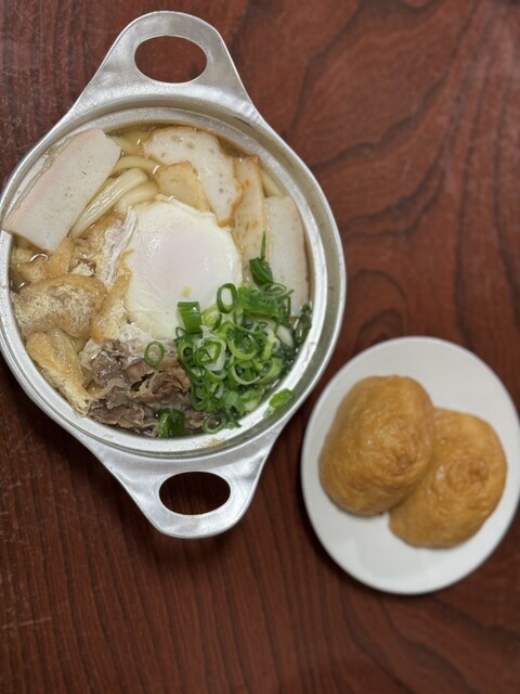 濃厚な鍋焼きうどんに付け合わせでいなり寿司を食べるのがスタンダードな様子。