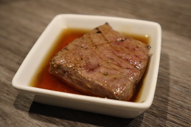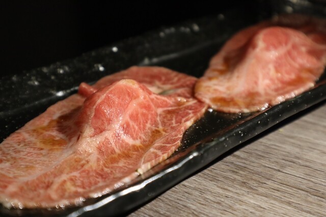 赤身の部分は下処理でカットしているようで、タンってこんなにジューシーで脂がのっていたっけ、、、?と感じさせらます。また細かく切り込みが丁寧に入っており、それも相まって口の中で溶けていくようなタンではなかなか味わえない食感です。「うまい、、、」とは言わずにいられない正に極タン。