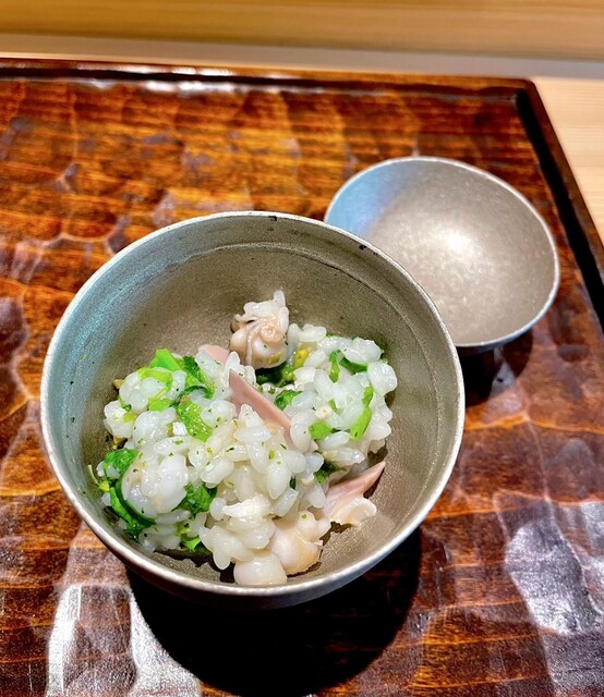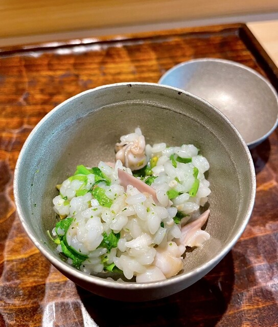 一品目はリゾット!寿司屋で?と思う間もなくとにかく旨い。太刀魚の燻製炙りも香り良く昆布出汁で伸ばした山わさびがまたとても良い。