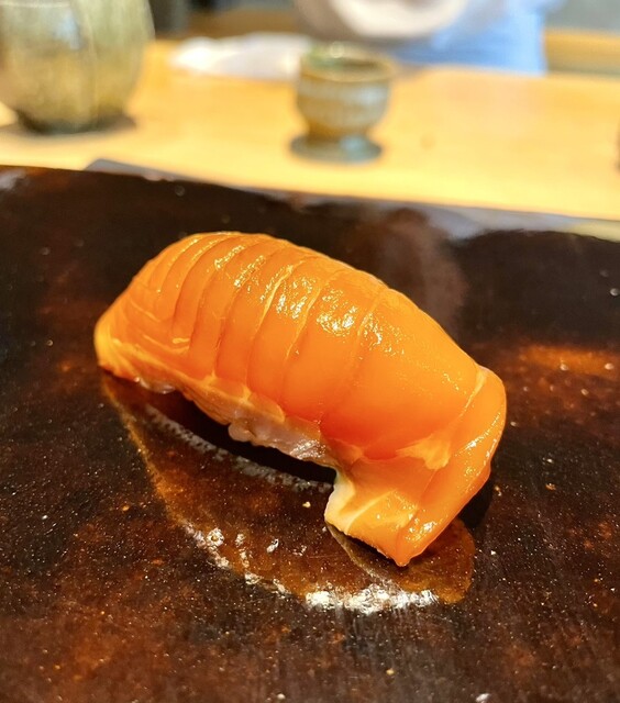 大トロは岩塩で、この組み合わせも初めてです。冷たいネタと温かいシャリが噛むと衝撃的に美味しくて岩塩が効いてますね!