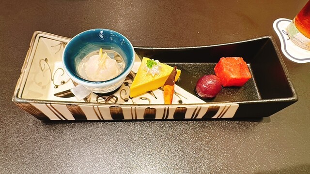 野菜の盛り合わせも新鮮で彩りがよく、出汁にくぐらせると野菜の甘みが増してまた違った美味しさ。豆腐やきのこ類も含めてバランスがよく、単なる“付け合わせ”以上に楽しめました。〆のご飯とお漬物、さらにデザートまで付いていて、最後まで満足度高いコースです。