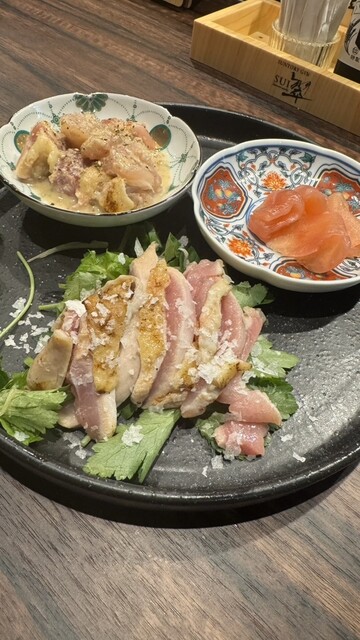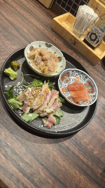 他にも「地鶏たたき三種盛り」を注文!レアな仕上がりで部位ごとに旨みの違いが楽しめる!さっぱりポン酢との相性が抜群で、お酒を誘う一皿!
