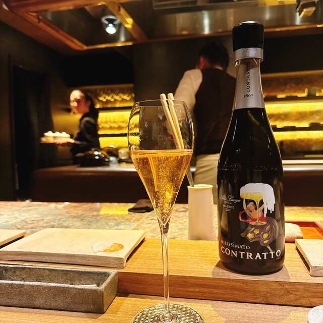 1杯目のドリンクをサービスしてくださるとのことで、なんと「ビール、またはシャンパン」とのことで、迷わずシャンパンを選んだのですが、イタリアのスパークリングでした。